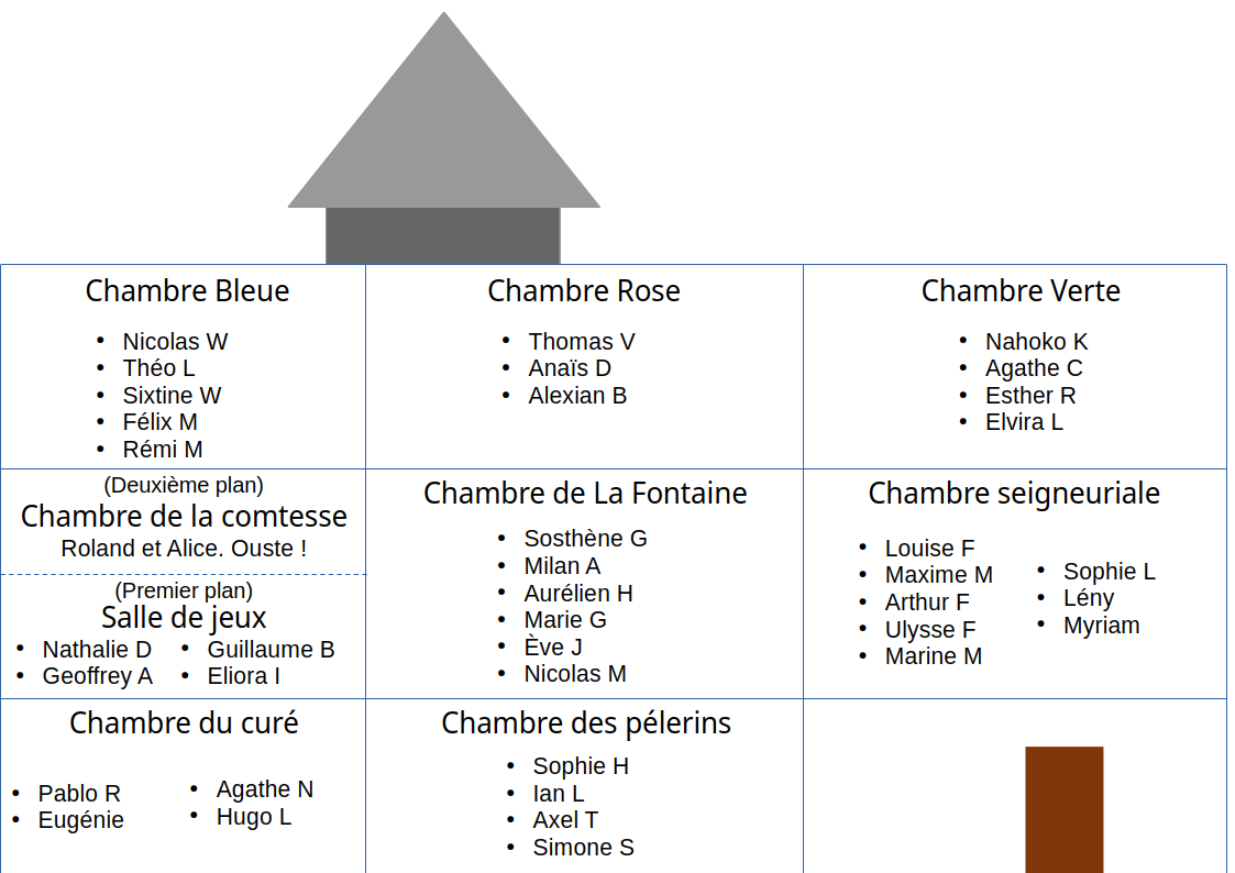 Nous avons fait un plan de chambre indicatif basé sur la contenance de chaque chambre. N'hésitez pas à échanger des places ou à ne pas le respecter, mais on préférerait n'avoir à nous occuper de rien.